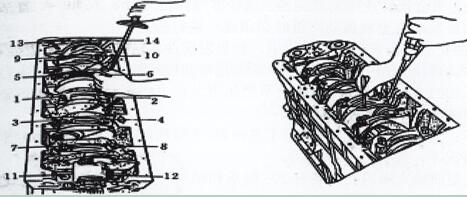 (5) 裝主軸承蓋參見圖2-3-8的要求安裝,并用銅錘敲到位。主軸承蓋螺栓螺牙上可加適量機(jī)油,并用手自由擰入幾牙。用扭力板手分三次由中間向兩端緊固。如圖2-4-9。
