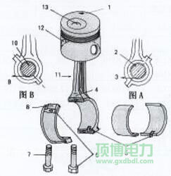 1、活塞頂面向前標記  2、連桿軸頸  3、運動方向  4、連桿體編號位置  5、定位唇及定位槽在同一側  6、連桿  螺栓松動時,此面被磨亮  7、連桿 螺栓不能互換和代用  8、連桿蓋編號位置與連桿體相同  9、運動方向  10、連桿軸頸  11、此側面有“O”向 前標記  12、機油噴鉤讓位口應在噴 鉤一側  13、渦流室(對YC6L機不偏心)對正噴油嘴    圖A、圖B是活塞在下死點時連桿軸頸的運動方向。
