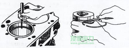 圖2-5-12  活塞環(huán)開口間隙的檢查    圖2-5-13  活塞環(huán)軸向間隙的檢查